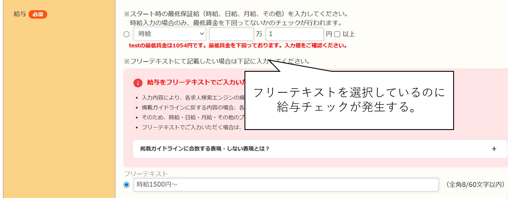 求人原稿を登録・編集する際、給与項目でフリーテキストを選択している場合でも