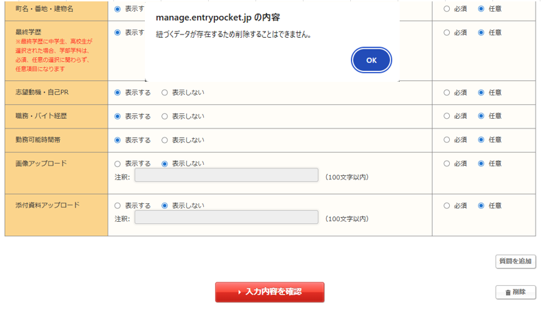 応募フォームテンプレートを削除する際に、求人原稿が紐づいていた場合