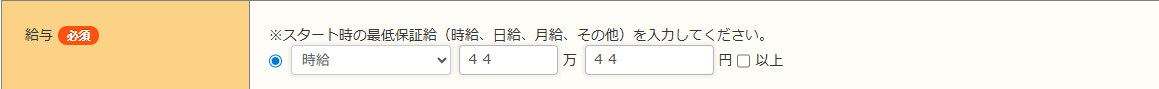 給与の「時給」「日給」「月給」を選択した際の「〇万」「〇円」欄と、